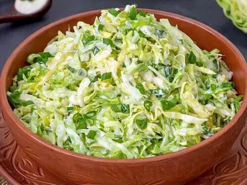 Πλένουμε και στεγνώνουμε καλά το λάχανο και τα πράσινα κρεμμυδάκια. Ψιλοκόβουμε το λάχανο και τα κρεμμυδάκια, κρατώντας μερικά κρεμμυδάκια για το γαρνίρισμα.
