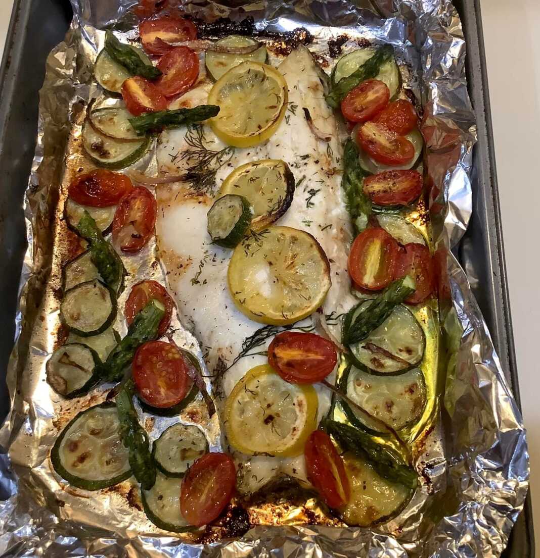 Ετοίμασα το ψάρι με αλάτι και πιπέρι. Περιχύνουμε με ελαιόλαδο και προσθέτουμε λεμόνι σε φέτες, κόκκινο κρεμμύδι, ντοματίνια, φέτες κολοκυθιού, άκρες από σπαράγγια και άνηθο.
