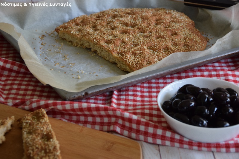 5. Βρέχουμε με νερό και πασπαλίζουμε με μπόλικο σουσάμι και λίγο ελαιόλαδο