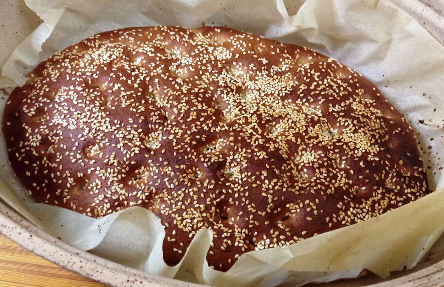Πασπαλίζουμε με σουσάμι και με τα δάχτυλά μας κάνουμε τα χαρακτηριστικά βαθουλώματα.