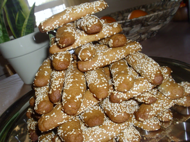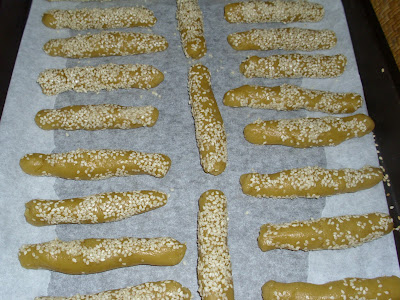 Τα ρίχνουμε επάνω στο βρεγμένο σουσάμι, τα κυλάμε λίγο να πάει το σουσάμι παντού, και με τα χέρια μας τα ρολάρουμε να τους δώσουμε ωραίο σχήμα