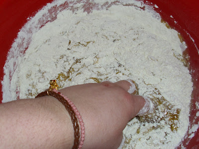 Τέλος ρίχνουμε λίγο-λίγο το αλεύρι, ανακατεμένο με το μπέικιν πάουντερ, μέχρι να γίνει μια μαλακή και εύπλαστη ζύμη.
