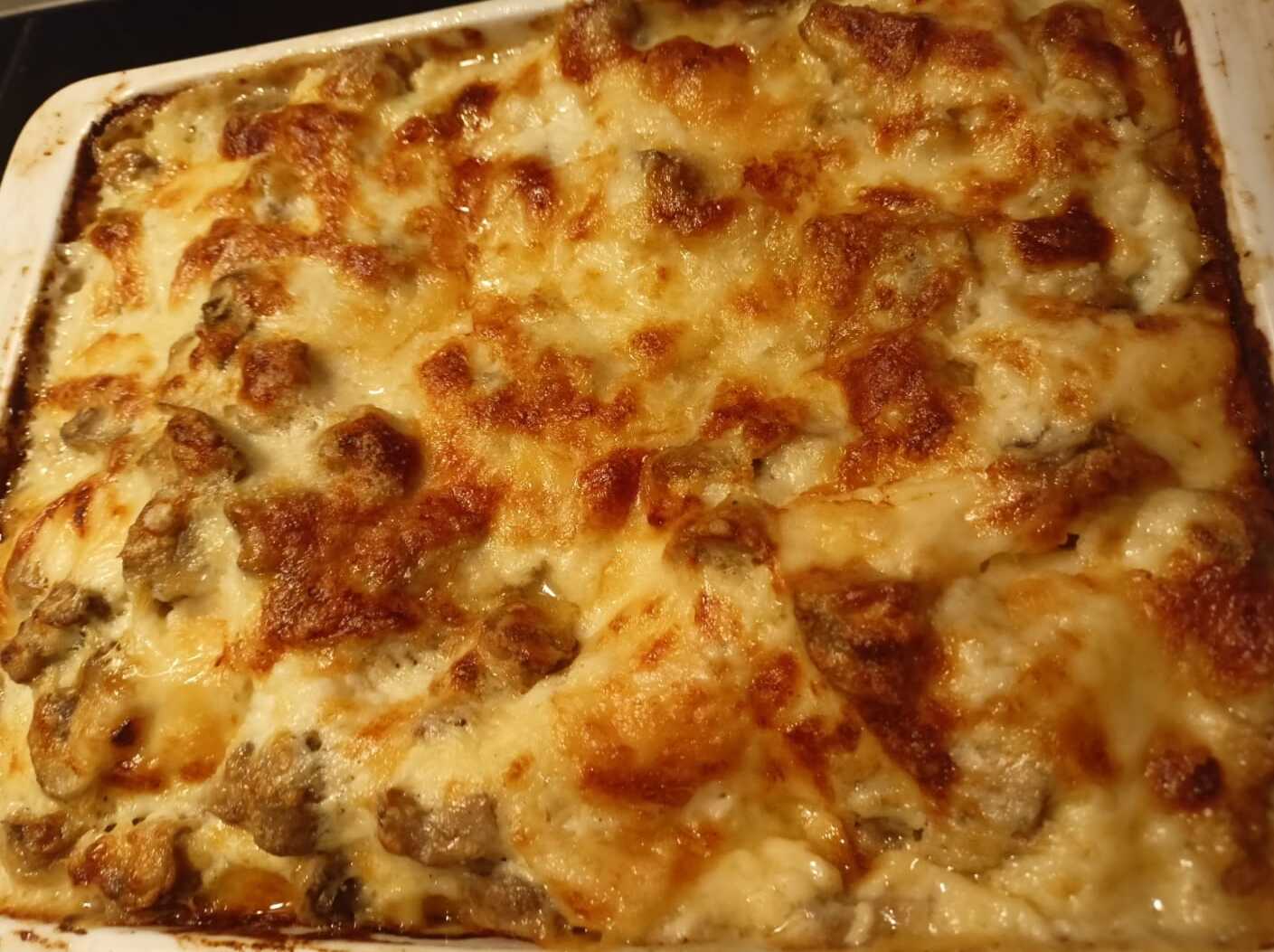 Από εδώ και πέρα μέχρι να εξαντληθούν όλα τα υλικά, εναλλάξ στρώσεις με σάλτσα μπεσαμέλ, κιμα, μανιτάρια, τυρί γκουντα, ένα πασπάλισμα τριμμένης παρμεζάνας, άλλη μια στρώση λαζάνια κ.ο.κ. Από πάνω βάζουμε μια στρώση λαζάνια, μια λεπτή στρώση μπεσαμέλ και ένα γενναιόδωρο πασπαλίσμα με τριμμένη παρμεζάνα. Ψήνετε τα λαζάνια στους 180° για περίπου 30 λεπτά, ή τέλος πάντων μέχρι να ροδίσει η επιφάνεια….