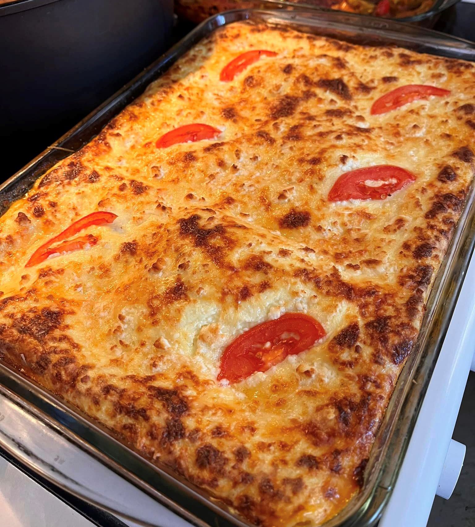Σε πυρέξ έστρωσα λαζάνια, μετά γέμιση μετά μιξ τυριών ( γραβιέρα, παρμεζάνα , γουντα κ λιγο καπνιστό μπετσοβονε) κ ξανα κ ξανα κ τέλος σκέπασα με λαζάνια κ από πάνω αραιή μπεσαμέλ , λίγη φέτα τριμμένη  κ λίγες φέτες ντομάτας έτσι για την ομορφιά. Καλύπτουμε με αλουμινόχαρτο (προσέχοντας να μην ακουμπάει στην επιφάνεια) και βάζουμε στο φούρνο για 30′. Αφαιρούμε το αλουμινόχαρτο και ψήνουμε ακόμα 7′-10′, μέχρι να ροδίσει η επιφάνεια. Αφήνουμε το φαγητό να σταθεί 10′ πριν το σερβίρουμε.