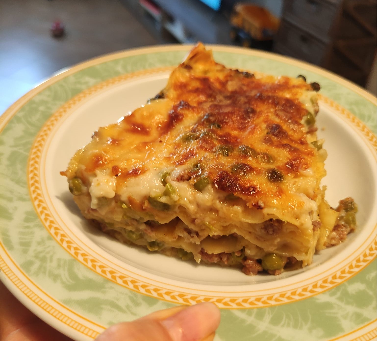 Στρώνουμε μια στρώση λαζάνια στο ταψί, από πάνω απλώνουμε μια στρώση ραγού και μετά μια στρώση μπεσαμέλ. Πασπαλίζουμε με λίγη παρμεζάνα. Επαναλαμβάνουμε τις στρώσεις μέχρι να τελειώσουν τα υλικά, τελειώνοντας με μπεσαμέλ και παρμεζάνα.