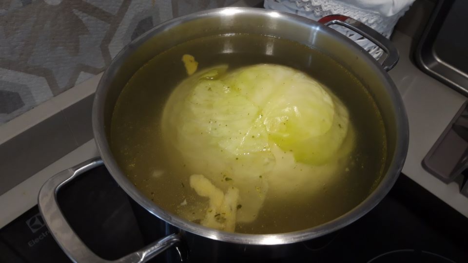 · Βράζουμε νερό σε μεγάλη κατσαρόλα · προσθέτουμε αλάτι, κύβο ζωμουκζωμού  1 κουταλιά δυόσμο. Βάλτε το λάχανο (την βάση προς τα κάτω) και το νερό να το καλύπτει και βράστε για 15 λεπτά