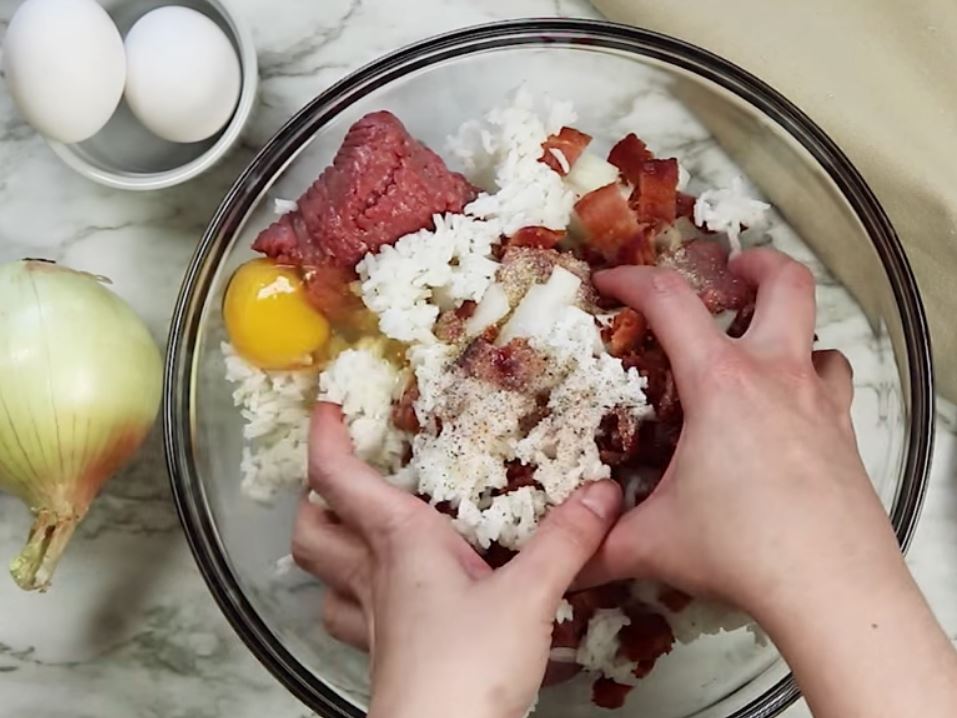 Σε ένα μεγάλο μπολ, προσθέστε κρέας, την φρυγανιά, το κρεμμύδι, το μπέικον, το ρύζι, το αυγό, αλάτι και πιπέρι. Ξεκινήστε χρησιμοποιώντας μόνο ένα αυγό. Εάν το μείγμα φαίνεται πολύ ξηρό, προσθέστε το δεύτερο αυγό.
