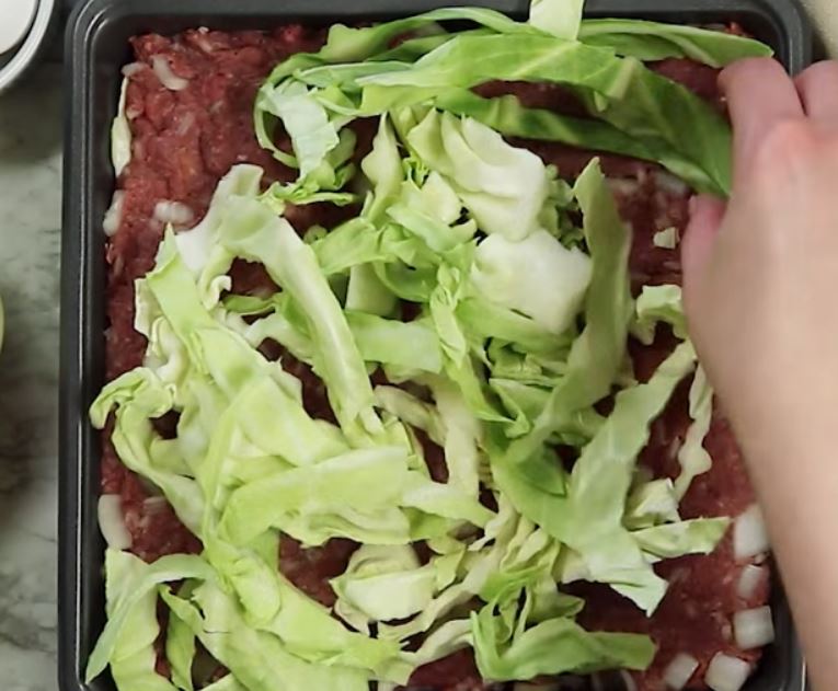 Προσθέστε ένα άλλο στρώμα λάχανου για να καλύψετε τον απλωμένο κιμά .