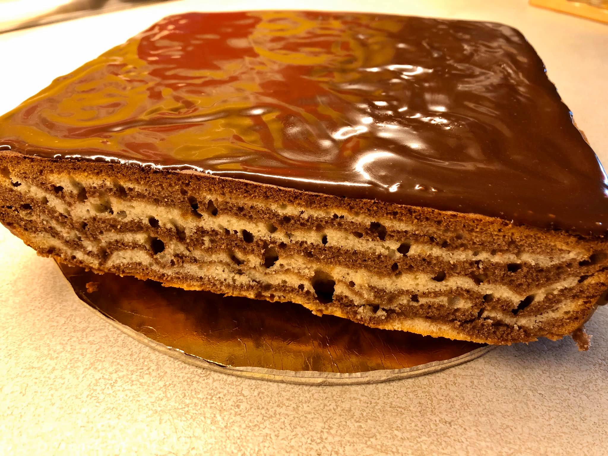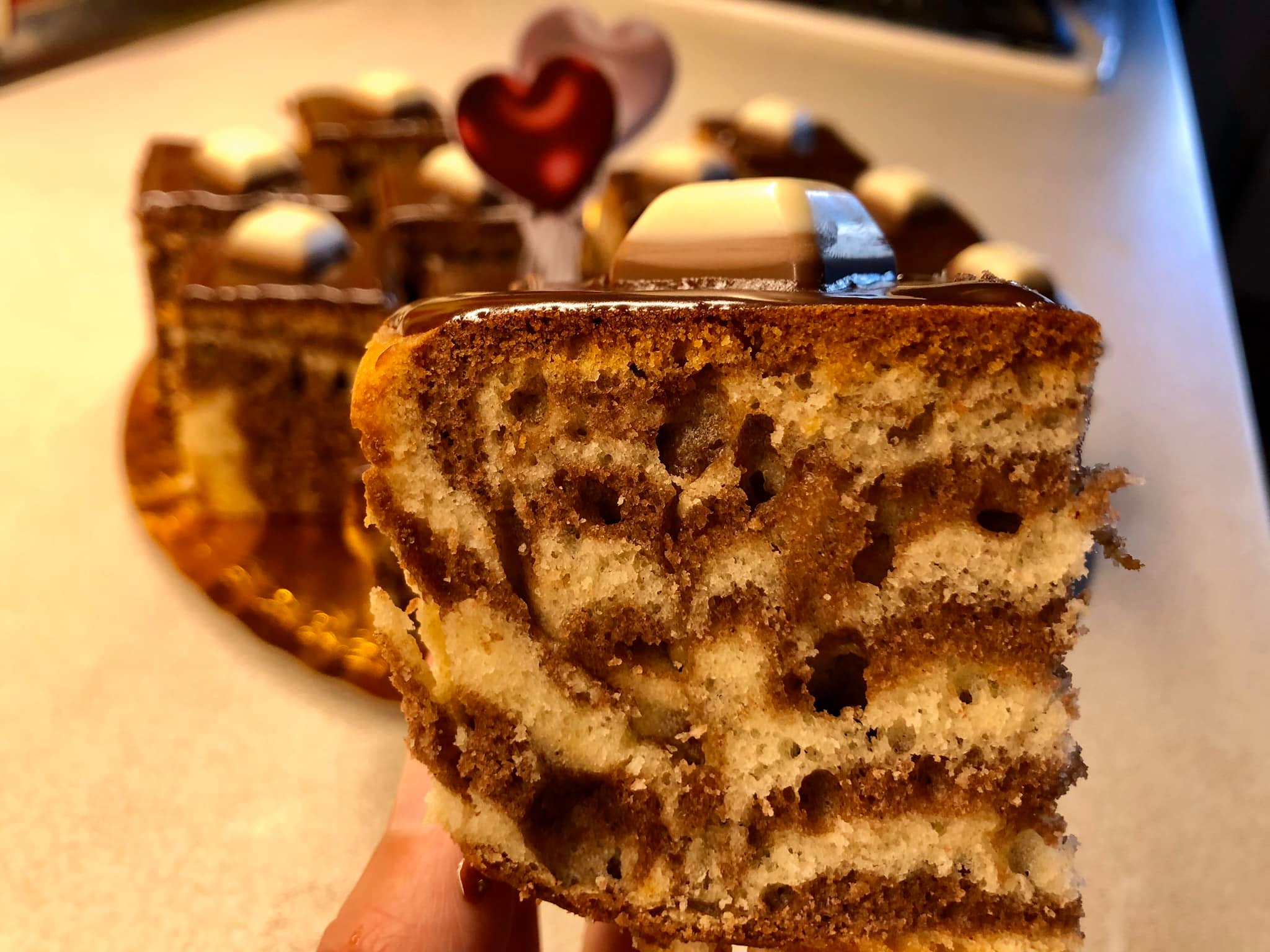 Τέλος με μια οδοντογλυφίδα τραβάμε γραμμές μια στο κέντρο, μια στα τοιχώματα του δίσκου και έτσι ελπίζω να καταλάβατε πόσο απλό είναι. Βάζουμε στο φούρνο στα 180 γρ και αφήνουμε για 40 λεπτά περίπου, το δοκιμάζουμε με μια οδοντογλυφίδα, το αφήνουμε να κρυώσει εντελώς και βάζουμε γλάσο από 100 γρ σοκολάτα γάλακτος και 3 κουταλιές της σούπας γάλα (λιωμένο στο φούρνο μικροκυμάτων ) βάζουμε στο ψυγείο μέχρι να σφίξει λίγο το γλάσο και μετά το τετραγωνίζουμε με ένα μαχαίρι, και κόβουμε το κέικ σε σχηματα που θέλουμε