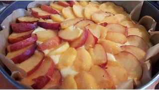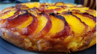 Στη συνέχεια βγάζετε την φόρμα από τον φούρνο και τακτοποιείτε φέτες ροδάκινων ή