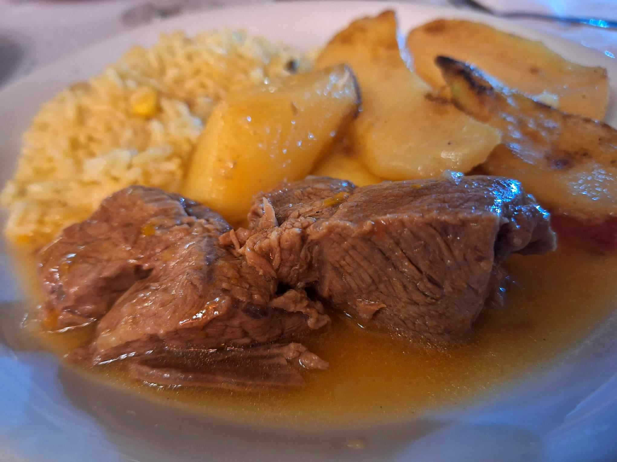 Σέρβιρα το κρέας με το ρύζι και πάτατες φούρνου.