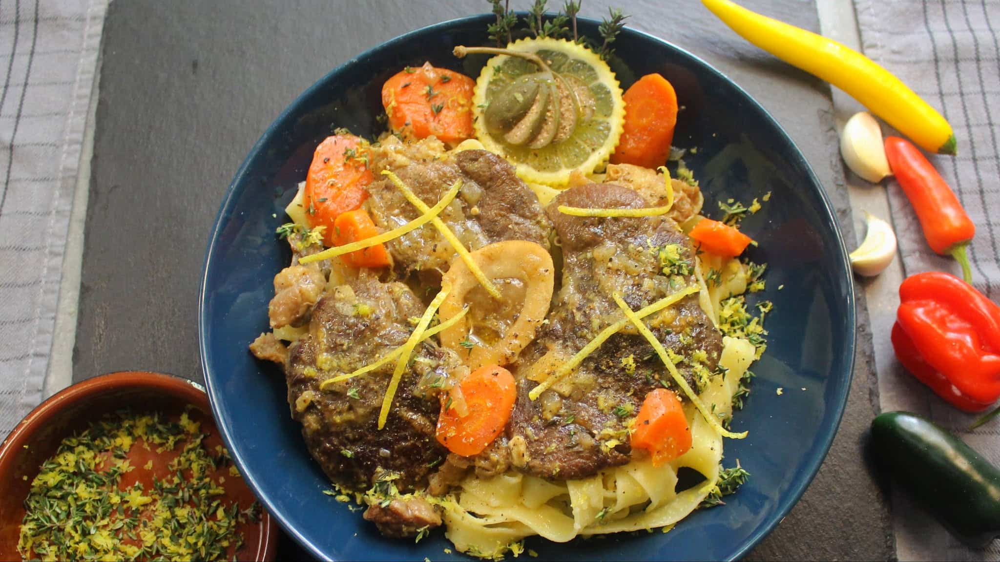 Ένα πιάτο με τρυφερό μοσχαρίσιο οσομπούκο, περιχυμένο με πλούσια λεμονάτη σάλτσα, σερβιρισμένο πάνω σε ζυμαρικά με τριμμένο τυρί.