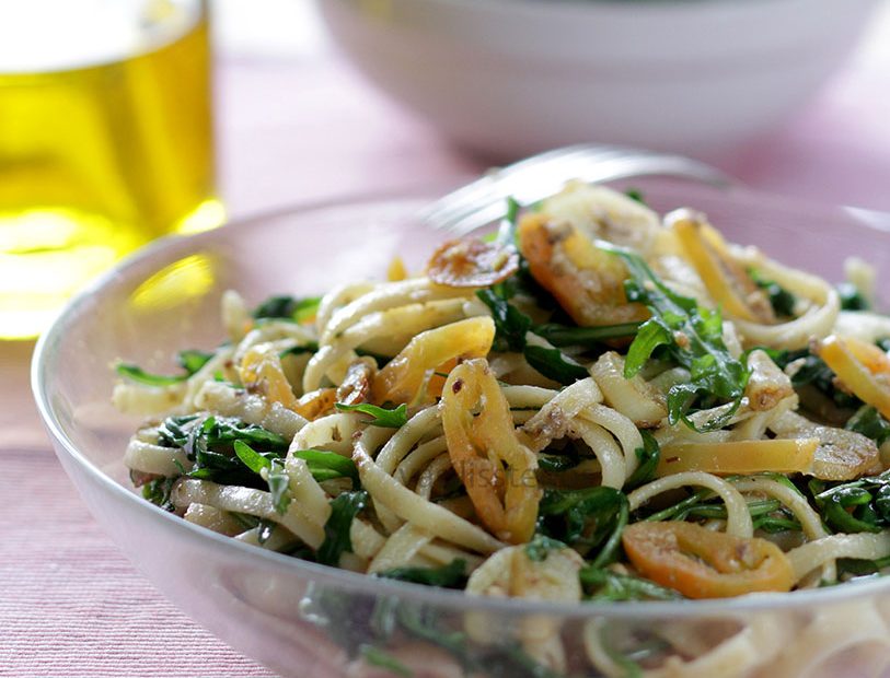 Ενώ τα ζυμαρικά βράζουν, θερμαίνετε 2 κουταλιές της σούπας ελαιόλαδο σε μια μεγάλη βαθιά κατσαρόλα σε χαμηλή φωτιά και σοτάρετε τις καυτές πιπεριές και το σκόρδο μέχρι να μαλακώσουν, περίπου 2 λεπτά. Προσθέστε την ρόκα, αλάτι, αυξήστε τη φωτιά και μαγειρέψτε για 2 – 3 λεπτά μέχρι να μαλακώσουν.