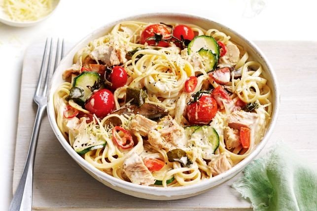 Προσθέστε τα ζυμαρικά, το υγρό των ζυμαρικών που κρατήσαμε, την κρέμα γάλακτος, την κόκκινη πιπεριά, (αν χρησιμοποιείτε) και τον τόνο μέσα στην σάλτσα. Μαγειρέψτε, για 1 λεπτό ή μέχρι να πηξει η σάλτσα μέσα στα ζυμαρικά.