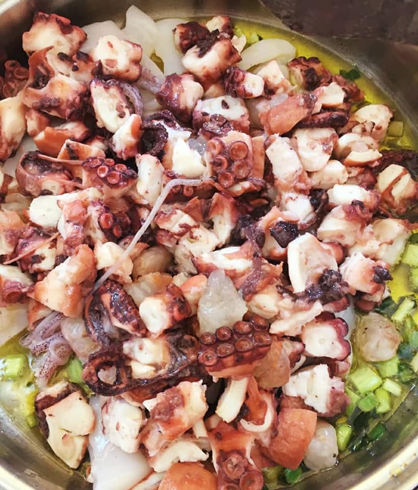 •400 grams of boiled octopus (previously boil 800-1k of octopus with 2 carrots, 2tbspns of vinegar,1onion,1 bay leaf, some black peppercorns and unpeeled garlic cloves. Keep from the juice a cup aside for the sauce)