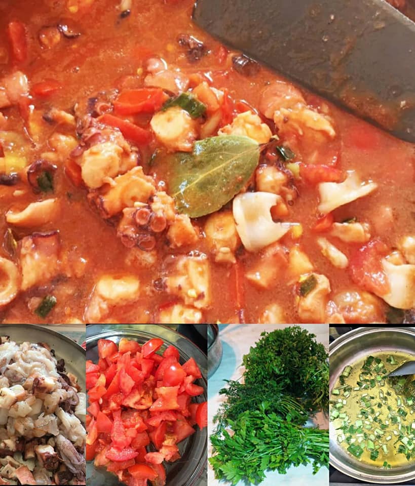 •Add the seafood. Then add the concasse tomatoes and tomato puree. Add sweet chili. Add another cup of the liquid that saved it when you boiled the octopus. Meanwhile, turn on the stove and place a pot of boiling water and salt on it. Boil Linguini pasta for less than 3-4 minutes. Drain them and combine over the sauce that is already boiling. Mix the pasta with the sauce and add the finely chopped parsley. Continue until the liquid is absorbed by the pasta which should remain aldente. Remove the pot from the stove. Linguine with seafood is ready. Serve it hot!