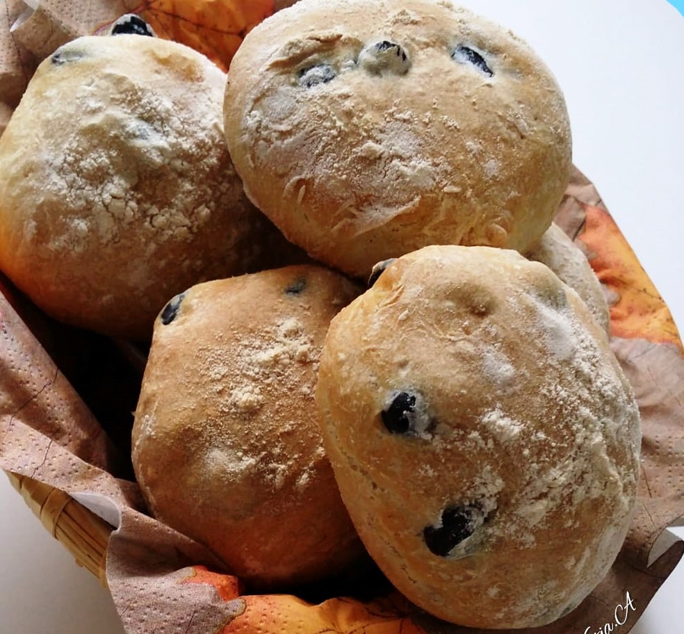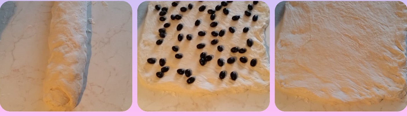 Σε επιφάνεια αλευρωμένη με σιμιγδάλι απλώνουμε τη ζύμη σε ορθογώνιο σχήμα, τοποθετούμε τις ελιές και τυλίγουμε σε ρολό, κόβουμε τα μικρά καρβέλια, τα αλευρώνουμε και τα αφήνουμε να φουσκώσουν για 30 λεπτά περίπου στο ταψί στρωμένο με λαδόκολλα και αλευρωμένα.