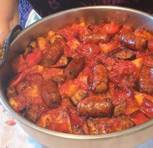 Λουκάνικα με πιπεριές φλωρίνης και μελιτζάνες στο Φούρνο
