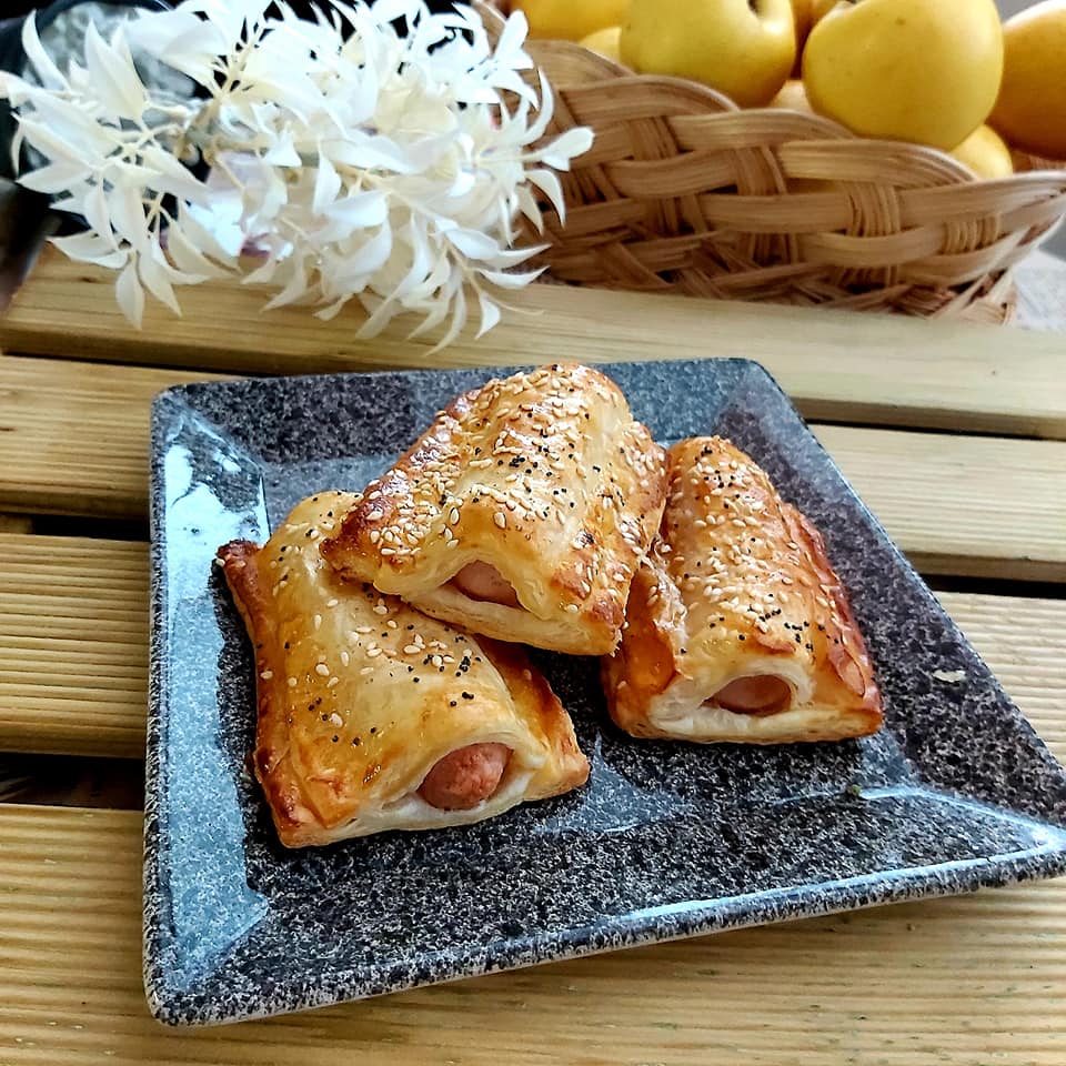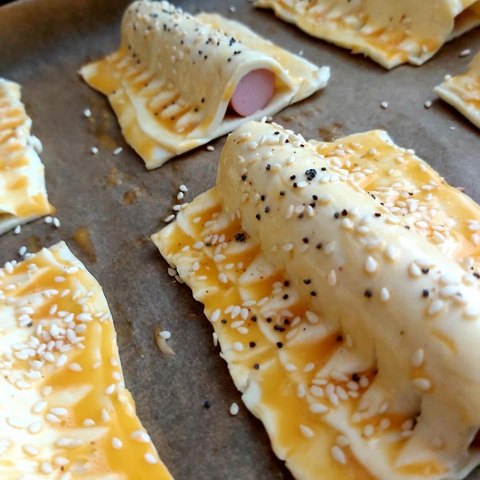 Στο κέντρο της κάθε σφολιάτας απλώνουμε τη σάλτσα bbq, βάζουμε τα λουκάνικα και πασπαλίζουμε με τα τυριά.