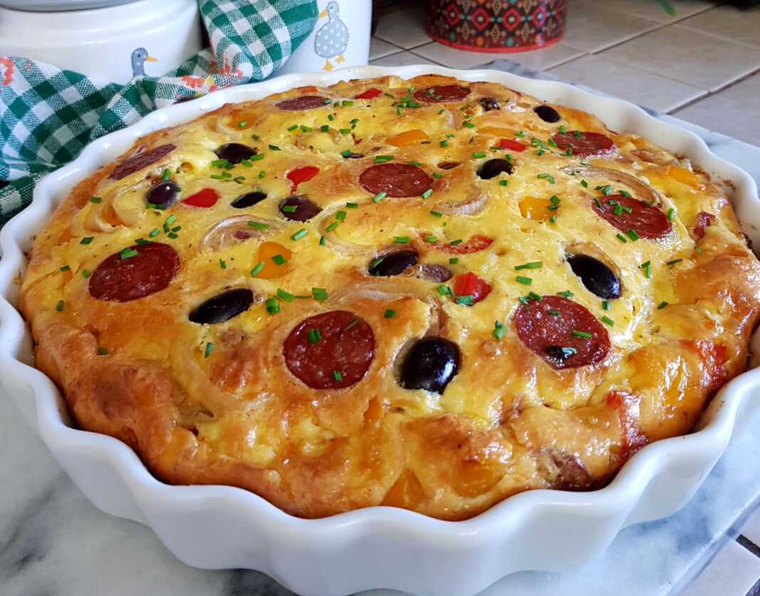 Όταν ψηθούν τα λαχανικά, προσθέστε το λουκάνικο και ανακατέψτε μαζί. Ρίξτε με κουτάλι τη γέμιση στο ταψί της πίτας σας μαζί με μερικές ελιές. (Αφήστε στην άκρη λίγη από τη γέμιση για να προσθέσετε από πάνω αφού ρίξετε το μείγμα κρέμας-αυγού).