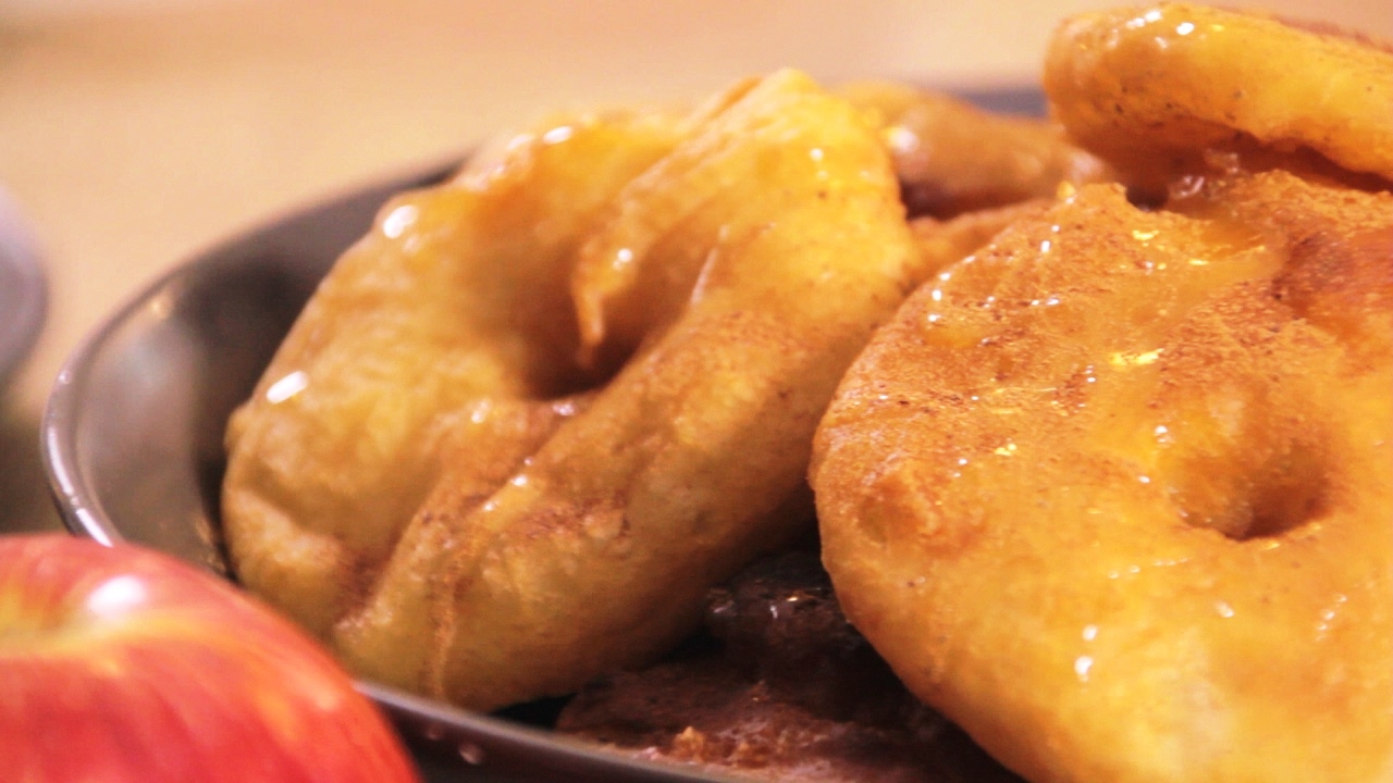 Βουτάω τα κομμάτια του μήλου στο χυλό και έπειτα τα ρίχνω λίγα λίγα στο λάδι. Τηγανίζω σε μέτρια ένταση, μέχρι να χρυσίσουν όμορφα.