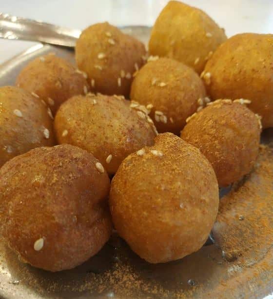 Βάζουμε σε κατσαρόλα πολύ λάδι να κάψει. Βουτάμε το ένα χέρι στη ζύμη και την πιέζουμε στην γροθιά μας. Κόβουμε με ένα βρεγμένο κουταλάκι κομμάτια από τη ζύμη που ξεχειλίζει ανάμεσα στο δείκτη και τον αντίχειρα και τα τηγανίζουμε. Μικρά κομμάτια, μισό κουταλάκι τσαγιού.