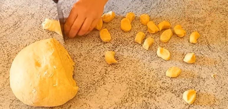 Αφήστε τη ζύμη να ξεκουραστεί για 15 λεπτά, αφαιρέστε μερικά κομμάτια ζύμης, δημιουργήστε κορδόνια και στη συνέχεια κσψτε μικρά κομμάτια με ένα μαχαίρι.