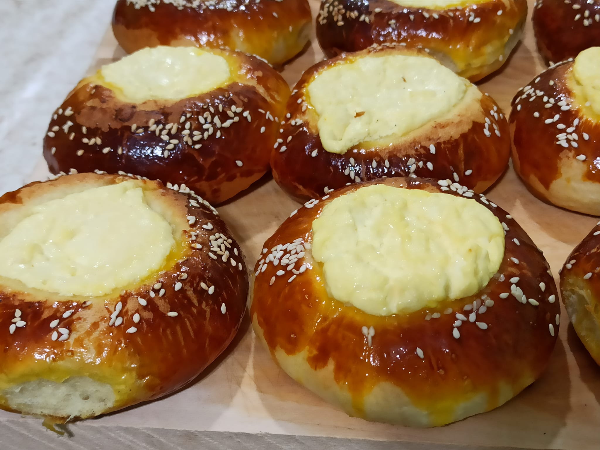 Χωρίζουμε τη ζύμη σε κομμάτια (έχω 20 κομμάτια των 65 γρ.) και σχηματίζουμε μπαλάκια. Βάλτε σε ένα ταψί και αφήστε να φουσκώσει για 30 λεπτά. Σε κάθε μπάλα, χρησιμοποιώντας τον πάτο του ποτηριού, κάντε βαθουλώματα.