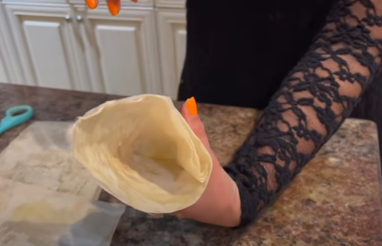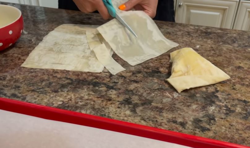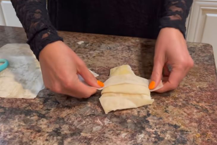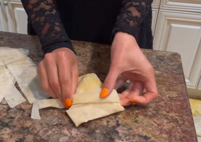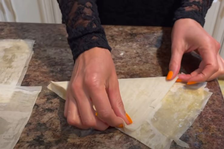 6. Πάρτε τη γωνία της ζύμης φύλλο τεσσάρων στρωμάτων και διπλώστε την έτσι ώστε να σχηματίζει ένα τρίγωνο αφήνοντας χώρο πριν το τελος του φύλου δηλαδή φτιαχνουμε το κλασικό μας χωνί που μας βαζανε παλια μέσα ξηρους καρπούς οι πλανόδιοι.