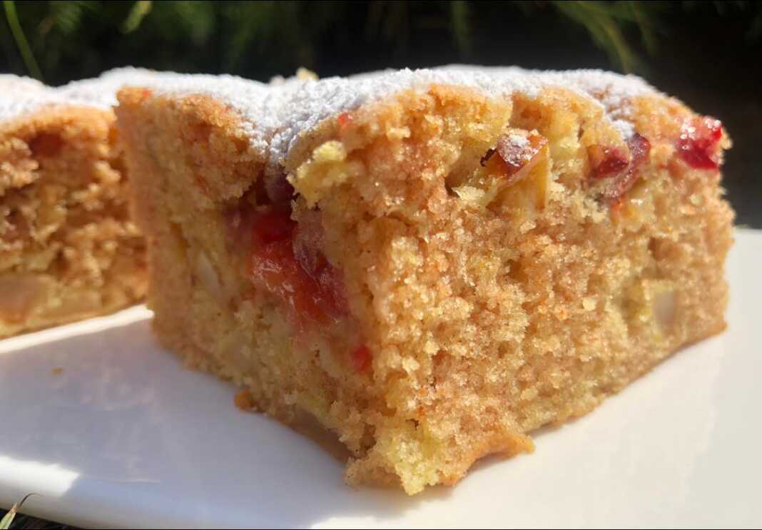 Ψήνουμε στους 180 βαθμούς περίπου 30 λεπτά. Αφήστε το να κρυώσει. Πρώτα πασπαλίζουμε το κέικ με ζάχαρη βανίλιας (έχω 10 γρ.), και μετά με ζάχαρη άχνη.