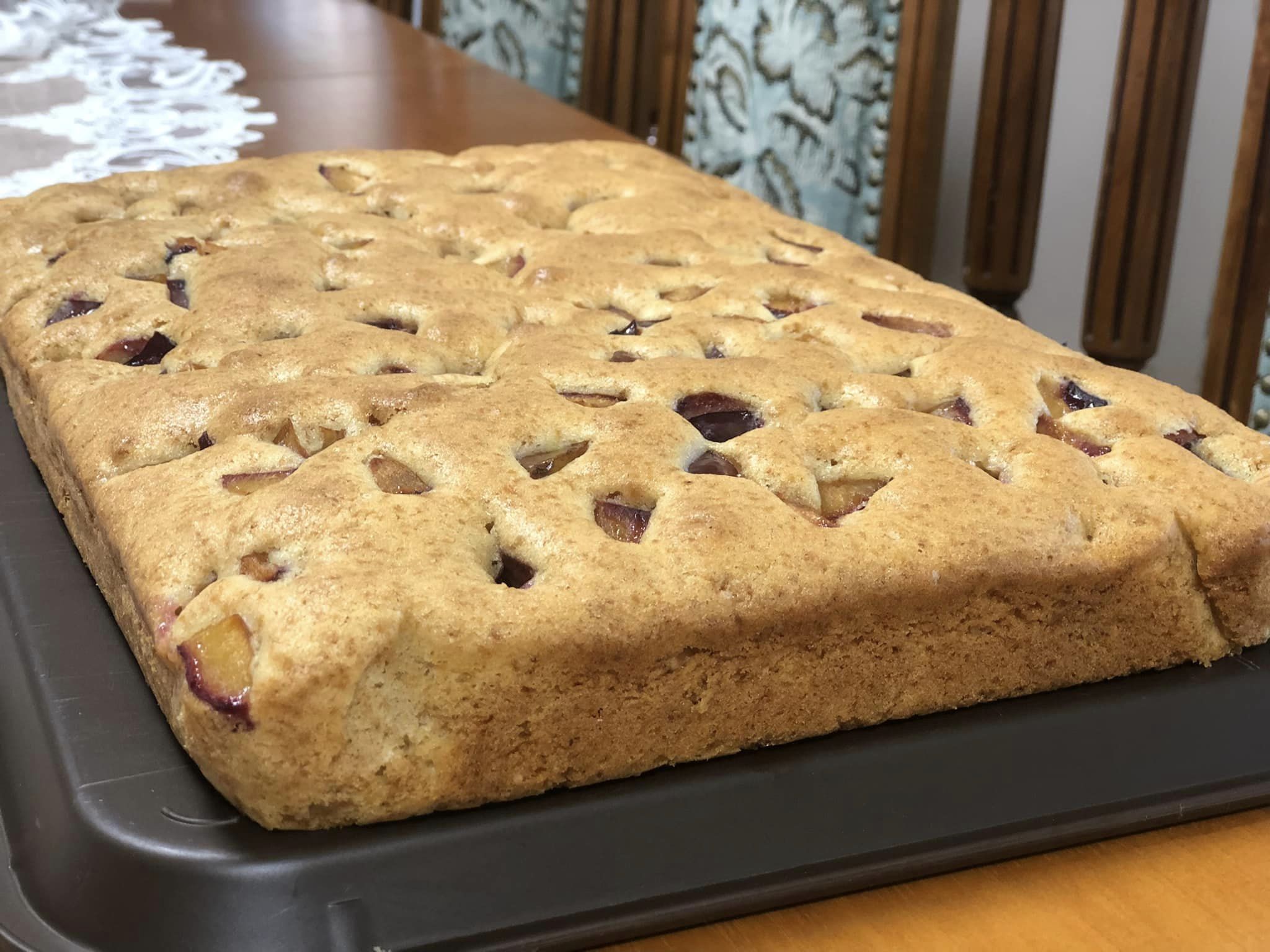 Μεταφέρετε την τελική μάζα σε ένα ταψί στρωμένο με περγαμηνή και το ισοπεδώνετε. Τοποθετούμε στη ζύμη τα δαμάσκηνα κομμένα σε φέτες και τα πιέζουμε λίγο μέσα στη ζύμη.