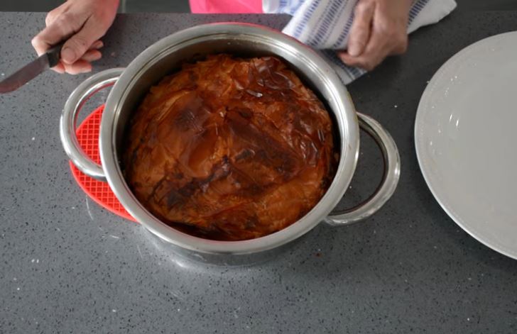 Βγάζουμε απ τον φούρνο παίρνουμε μια πιατέλα και αναποδογυρίζουμε την τυρόπιτα μας. Αφήνουμε να κρυώσει λίγο κόβουμε και σερβίρουμε.