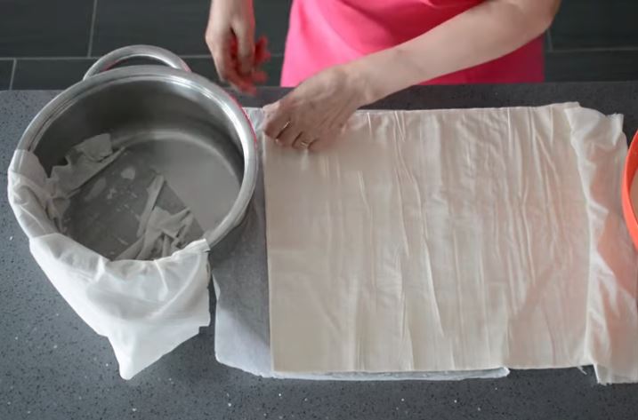 Παίρνουμε ένα φύλλο και το τοποθετούμε στην κατσαρόλα μόνο όμως το μισό. Το άλλο μισό είναι έξω από την κατσαρόλα. Βάζουμε 3-4 φύλλα με αυτό τον τρόπο.