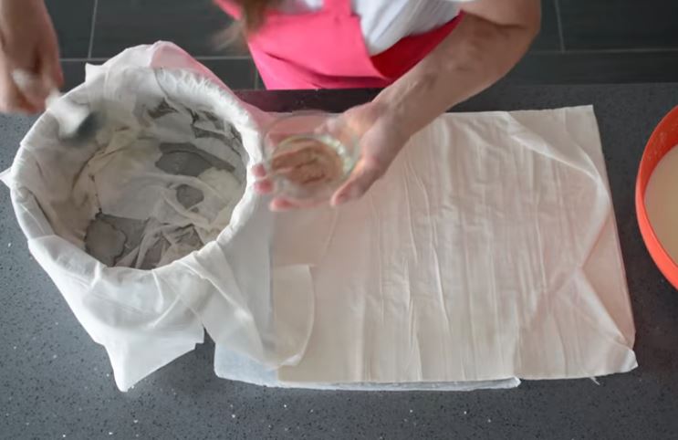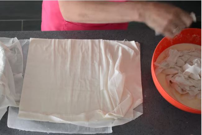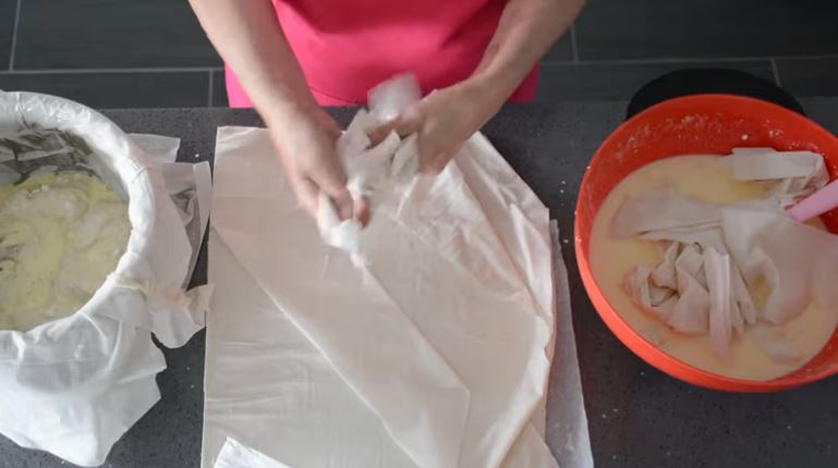 Τα εξωτερικά φύλλα τα γυρίζουμε και καλύπτουμε το μείγμα μας. Δεν ξεχνάμε να τα λαδώσουμε ενδιάμεσα.