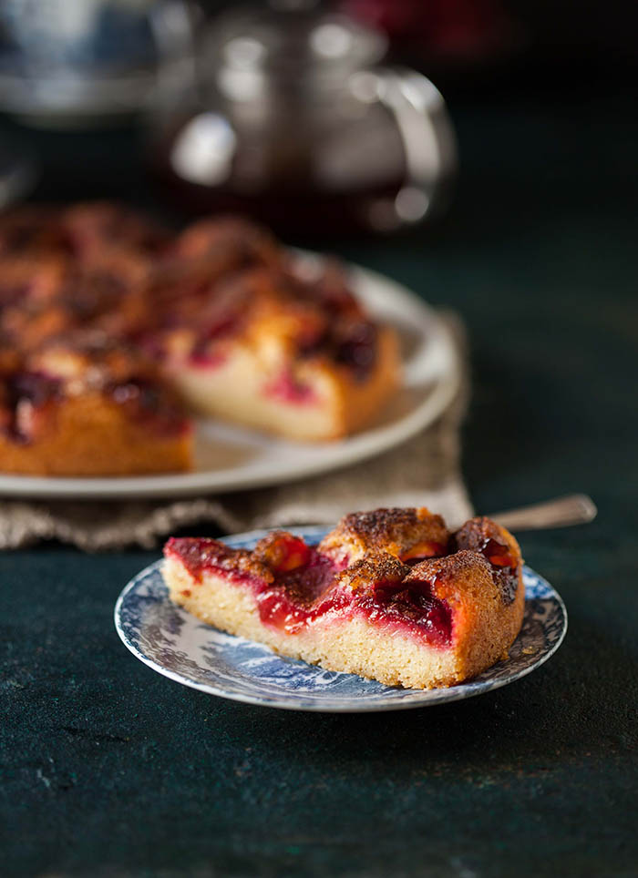 Βάλτε με ένα κουτάλι το μείγμα σε μία βουτυρωμένη αποσπώμενης βάσης φόρμα για κέικ 23 cm με το κάτω μέρος να είναι στρωμένο με χαρτί ψησίματος και εξομαλύνετε την κορυφή από πάνω. Απλώστε τα δαμάσκηνα, με τον φλοιό προς τα πάνω, ομοιόμορφα πάνω από το μείγμα. Πασπαλίστε την κορυφή με το χυμό λεμονιού, μετά την κανέλα και τις εναπομείναντες δύο κουταλιές της σούπας ζάχαρη