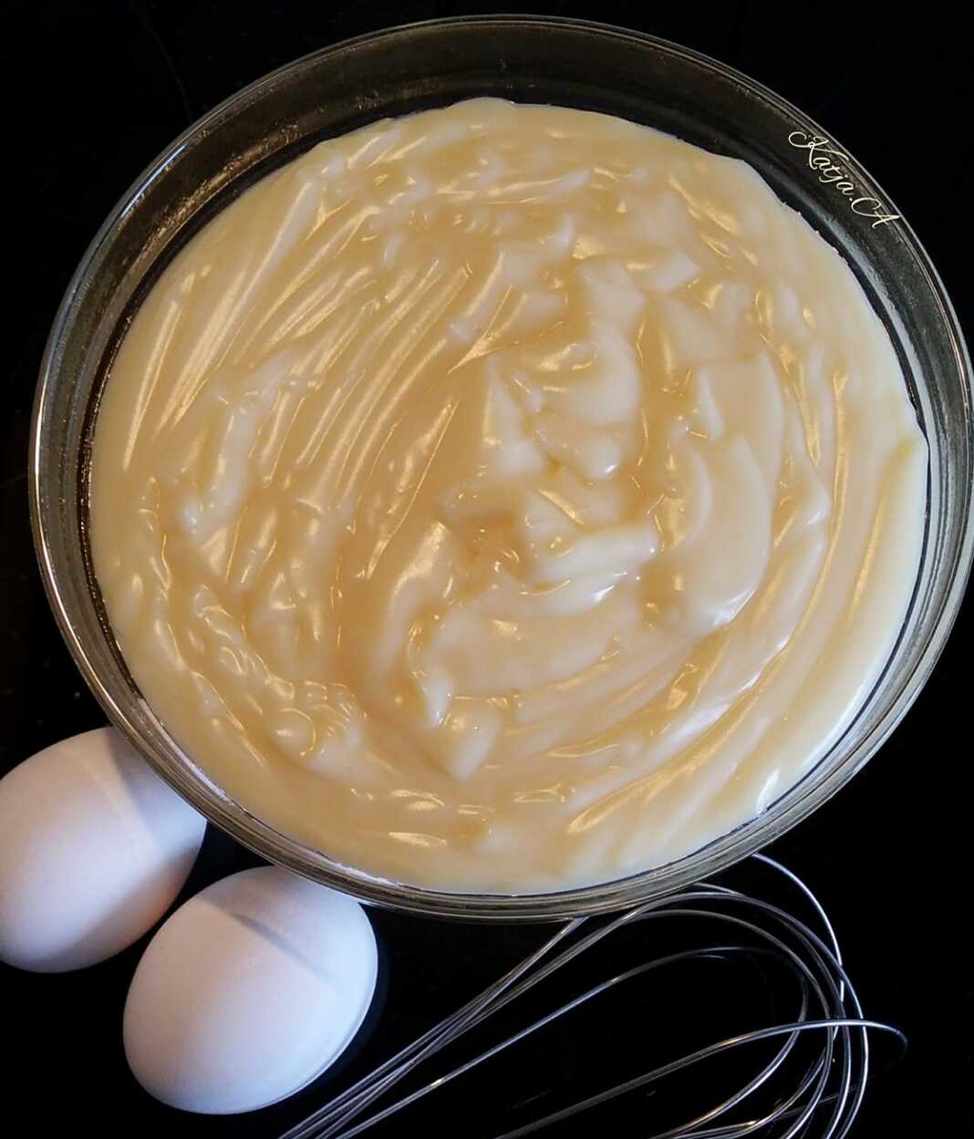 Σε ένα μπολ χτυπάμε τα αβγά με σύρμα χειρός, προσθέτουμε τη ζάχαρη, το κορν φλαουερ και ανακατεύουμε καλά,προσθέτουμε το ζεστό γάλα με τη μία και ανακατεύοντας συνεχώς, το βάζουμε στη φωτιά μέχρι να πήξει.