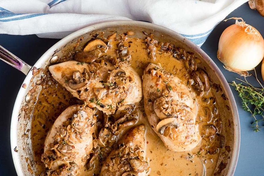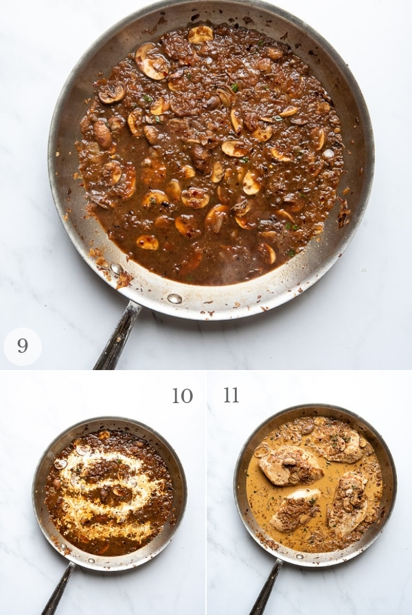 Μειώστε τη φωτιά στο χαμηλό, ανακατέψτε την κρέμα γάλακτος. Προσθέστε το κοτόπουλο πίσω στην κατσαρόλα και ρίξτε τη σάλτσα πάνω από το κοτόπουλο και αφήστε να ζεσταθεί η σάλτσα για λίγα λεπτά.
