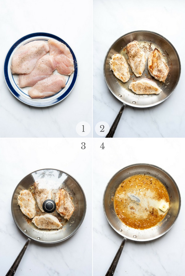 Αλατίστε τρίβοντας τα στήθη κοτόπουλου. Λιώστε 2 κουταλιές της σούπας βούτυρο σε ένα μεγάλο τηγάνι (με καπάκι) πάνω σε μέτρια υψηλή θερμότητα. Τοποθετήστε τα στήθη κοτόπουλου στο τηγάνι και μαγειρέψτε 4 λεπτά, ανακατέψτε και μαγειρέψτε άλλα 4 λεπτά.