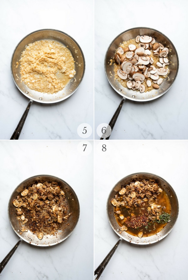 Λιώνουμε τις υπόλοιπες 2 κουταλιές της σούπας βούτυρο στην ίδια κατσαρόλα σε μέτρια φωτιά. Προσθέστε τα κρεμμύδια και σοτάρετε για να τα συνδυάσετε με το βούτυρο και σηκώστε χαλαρά κομμάτια από το κοτόπουλο. 1-2 λεπτά. Προσθέστε τα μανιτάρια και ανακατέψτε για να τα συνδυάσετε. Συνεχίστε το μαγείρεμα ανακατεύοντας περιοδικά για 15 λεπτά.