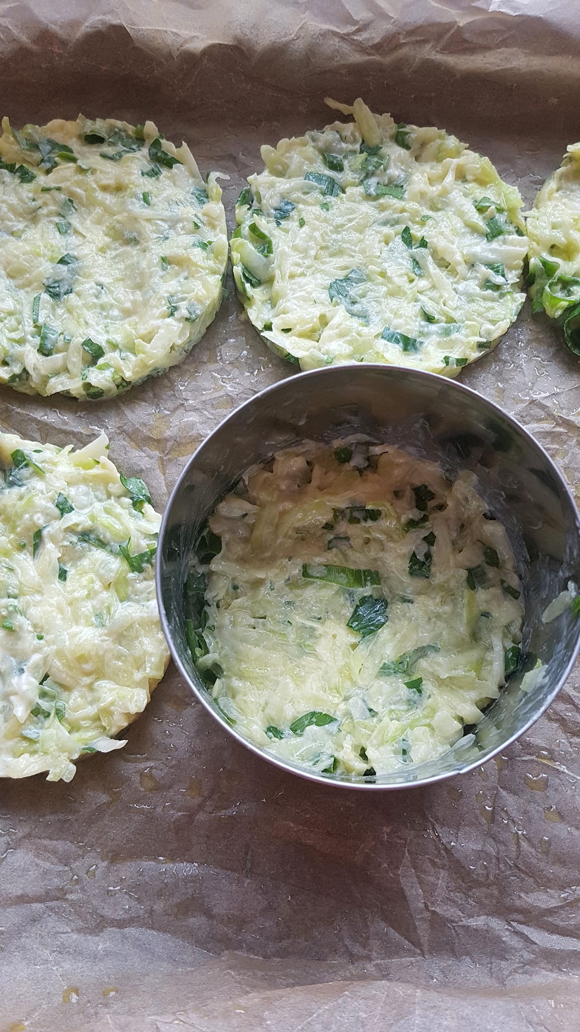 Ζυμώστε τα κολοκυθάκια, τυρι κρέμας και το αυγό και φτιάξτε τις βάσεις. Φυσικά, μπορείτε να κάνετε άμεσα μία μεγάλη, αλλά αυτή η ιδέα τρέχει στο μυαλό μου για πολύ καιρό και αποφάσισα να το δοκιμάσω. Χρησιμοποίησα ένα δαχτυλίδι για τη διαμόρφωση. Θα το δείτε σε μία από τις φωτογραφίες.
