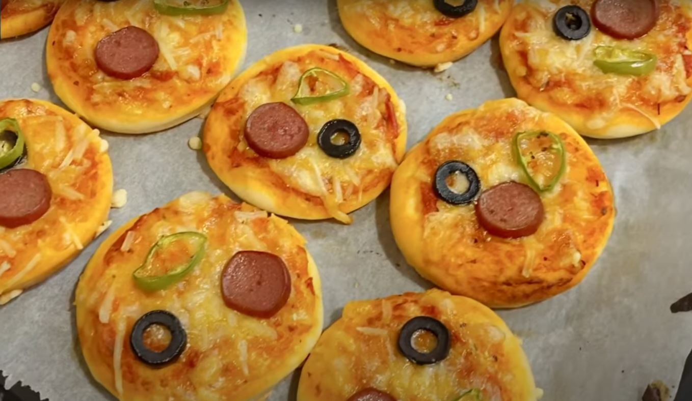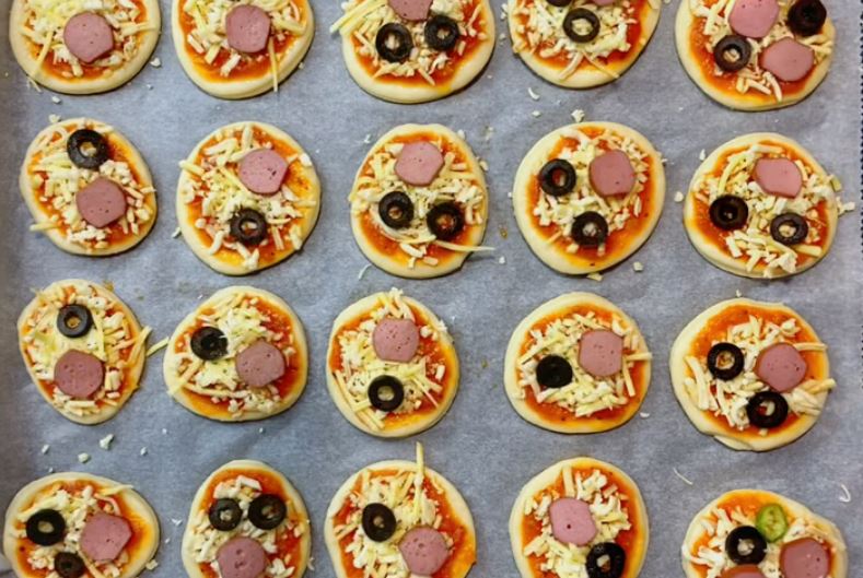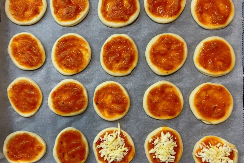 Απλώνουμε τα πιτσάκια σε ένα ταψί στρωμένο με χαρτί ψησίματος απο πάνω βάζουμε σάλτσα τυρί τριμμένο