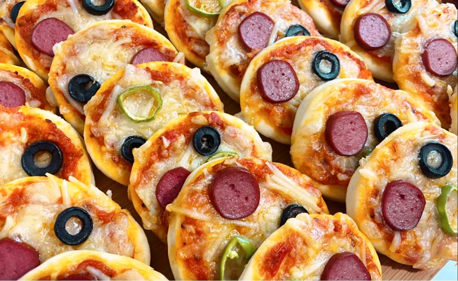Απλώνουμε τα πιτσάκια σε ένα ταψί στρωμένο με χαρτί ψησίματος απο πάνω βάζουμε σάλτσα τυρί τριμμένο