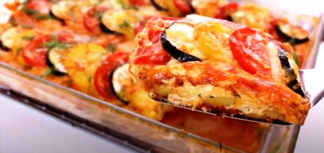 Τέλος στρώνουμε σειρές με κολοκύθια πατατα και ντομάτα εν αλλαξ που επικαλύπτονται και πασπαλίζουμε πάλι με τυρί.