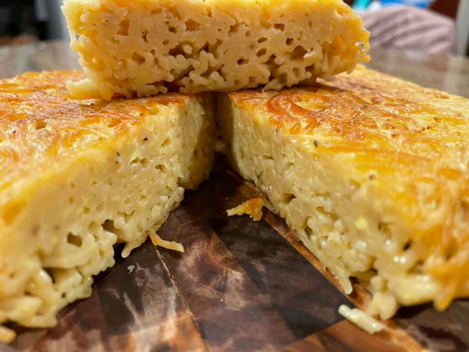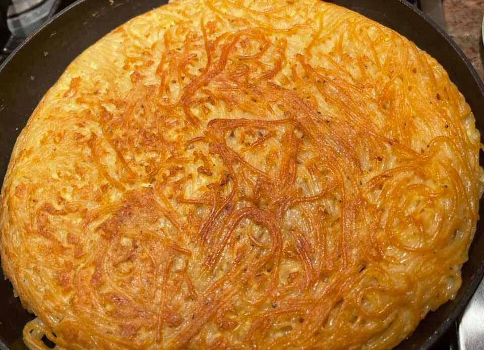 Αναποδογυρίζουμε τη πίτα μέσα στο τηγάνι βάζοντας ένα δίσκο από πάνω και αναποδογυρίζοντας στο ταψί. Προσέξτε να μην καείτε.
