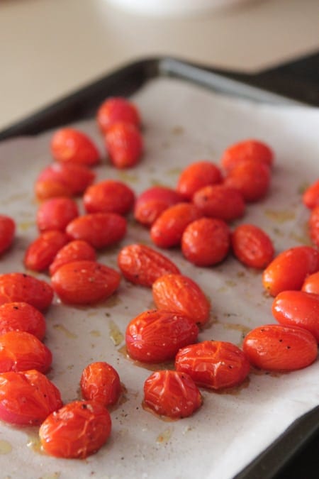Τοποθετήστε τα ντοματίνια πάνω σε ένα ταψί στρωμένο με λαδόκολλα. Πασπαλίστε με ελαιόλαδο και με αλάτι και πιπέρι. Ψήστε στους 190 βαθμούς για 10-12 λεπτά, μέχρι να οι ντομάτες ψηθούν καλά. Βγάλτε και αφήστε στην άκρη.