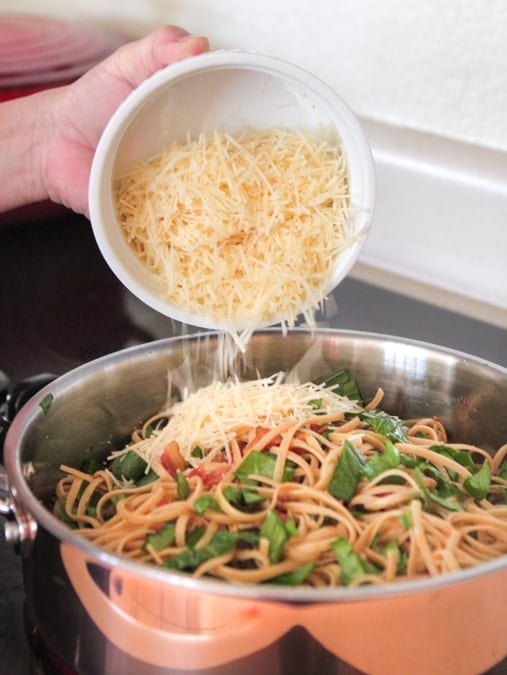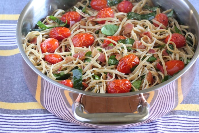 Μαγειρέψτε τα ζυμαρικά σύμφωνα με τις οδηγίες συσκευασίας. Στραγγίξτε. Τοποθετήστε το λάδι σε μία κατσαρόλα σε μέση φωτιά. Ρίξτε μέσα τα μαγειρεμένα ζυμαρικά και στη συνέχεια ανακατεύετε το μπέικον, σπανάκι, παρμεζάνα, αλάτι και πιπέρι.