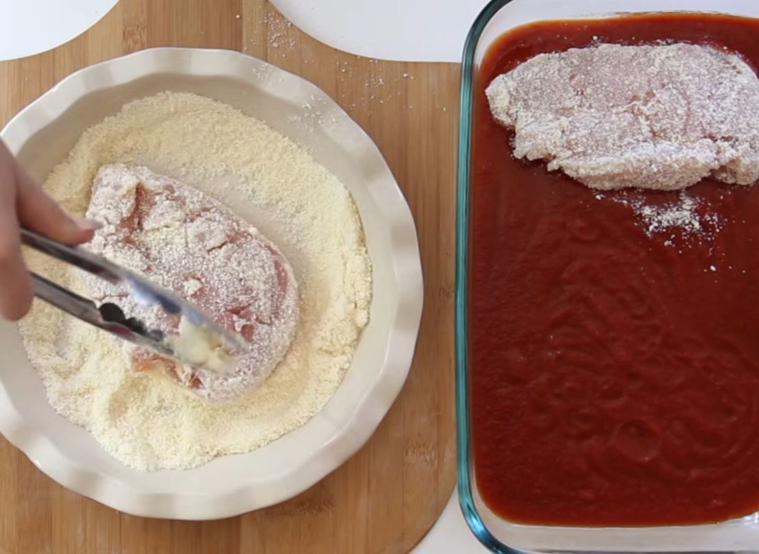 Βάλτε το επικαλυμμένο κοτόπουλο στο πυρέξ με την σάλτσας μαρινάρα.