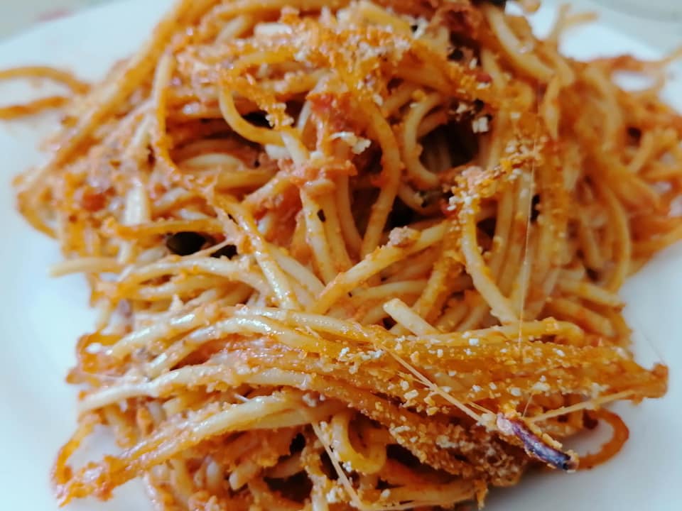 Ανακατεύουμε τα μακαρόνια με τη σάλτσα και τις μελιτζάνες και την κρέμα,