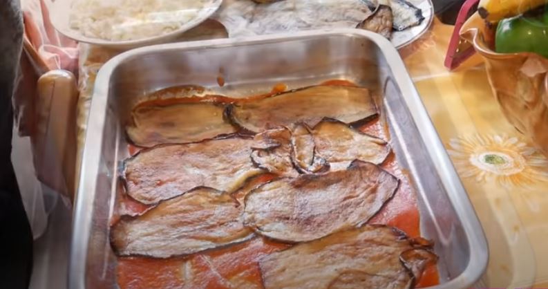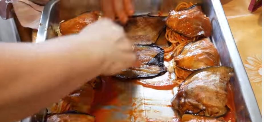 Διπλώνουμε την μελιτζανα πάνω από τα μακαρόνιά και συνεχίζουμε μέχρι να γεμίσει το πυρεξ μας.
