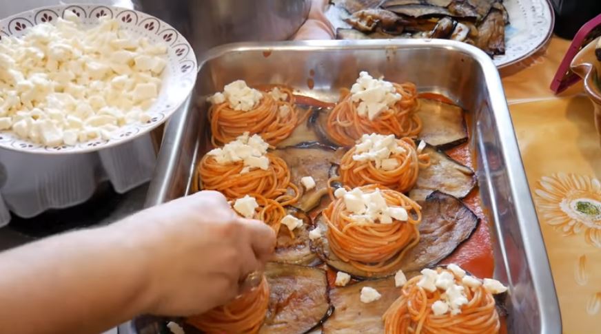 Πάνω από τις μελιτζάνες βάζουμε φωλιές από μακαρόνια και πάνω από τα μακαρόνια μοτσαρέλα.